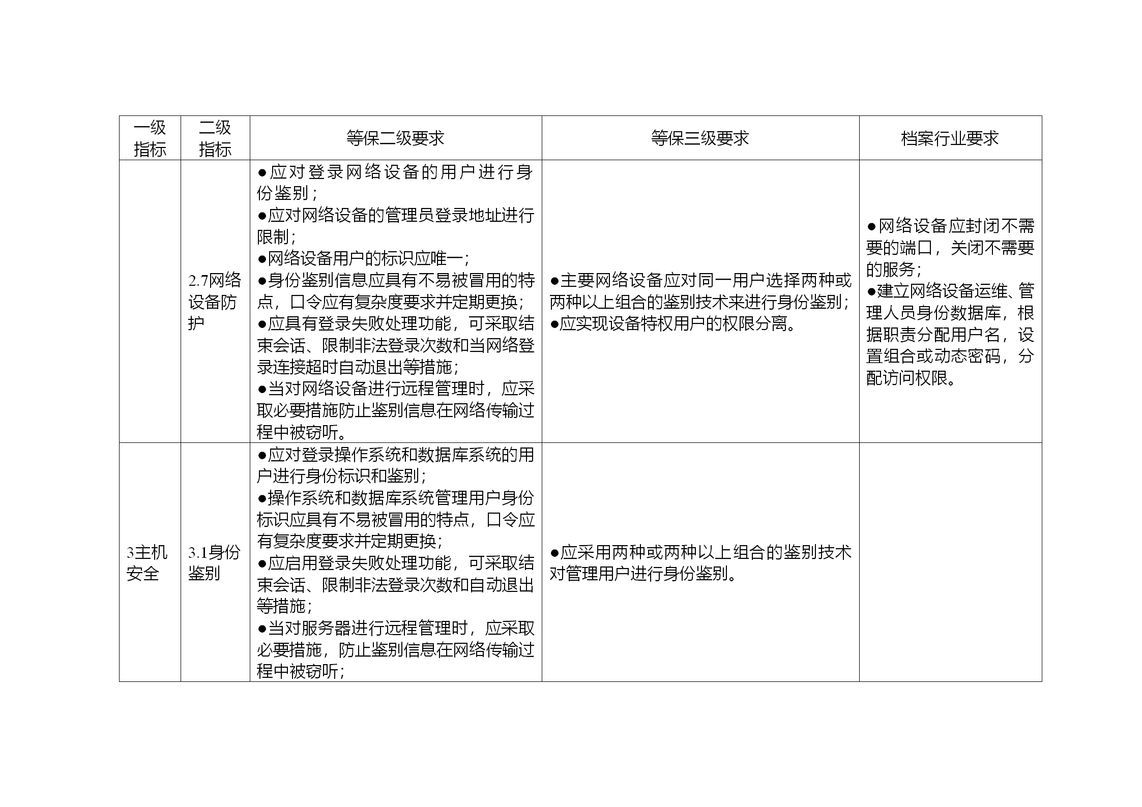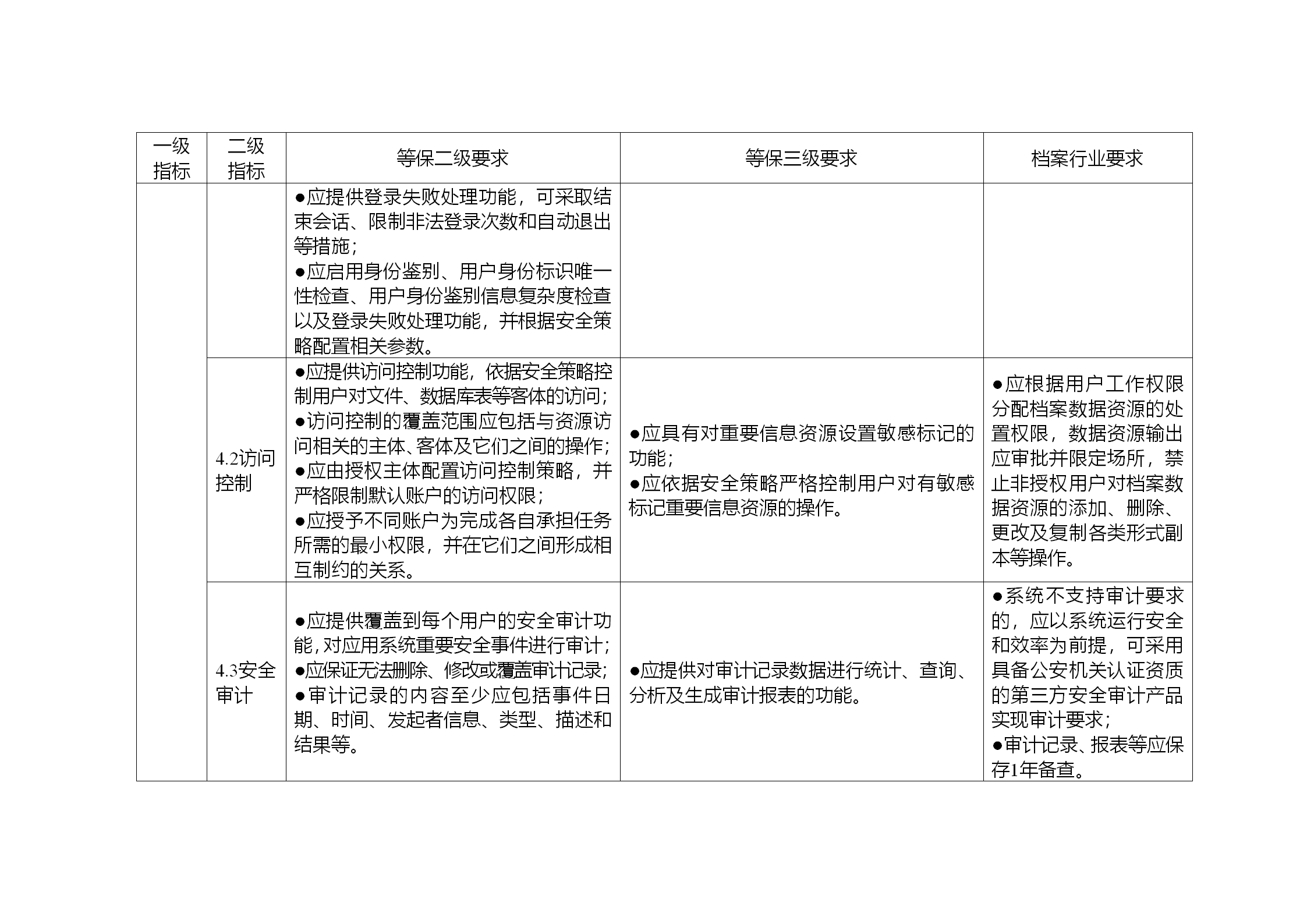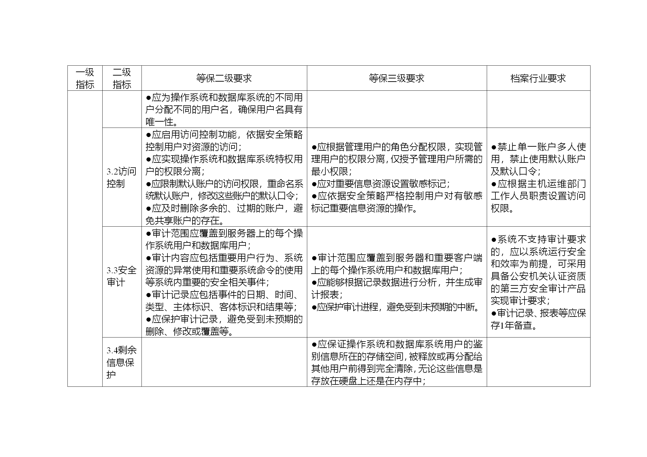 3.安全保护水平与等保二级保护水平相同的系统,除满足“等保二级要求”中的具体要求之外,还需同时满足“档案行业要求”。安全保护水平与等保三级保护水平相同的系统,除满足“等保三级要求”的具体要求之外,还需同时满足“等保二级要求”,和“档案行业要求”。